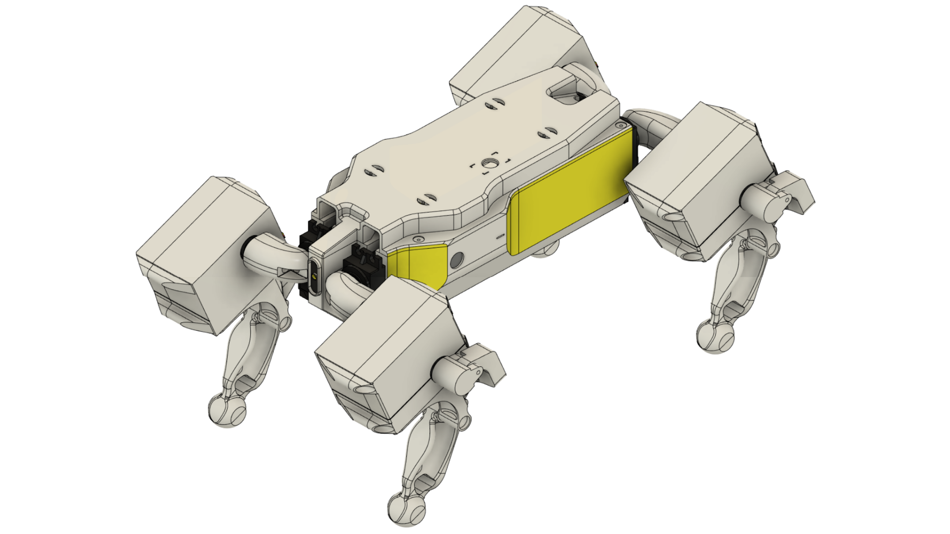 The quadruped was built with the intent to make it easy to train, meaning stubby legs and dividing it into homogenous segments to save on URDF objects and thus give my laptop at least some chance of surviving the training process. There were some cute details to it, like the slots on top for cables for a harness that never got built, the fairly clean cable management, and the fact that all screws are easily accessible.