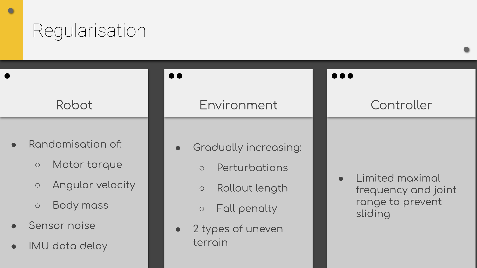 I made an URDF of the physical robot (more on this later) using the inertial data from Fusion 360 and a PyBullet-based environment compatible with the OpenAI Gym framework (this was before it was discontinued). In order to make the policy robust to the sim-to-real gap, I randomised a bunch of things, here’s the slide about them from my presentation on the project: