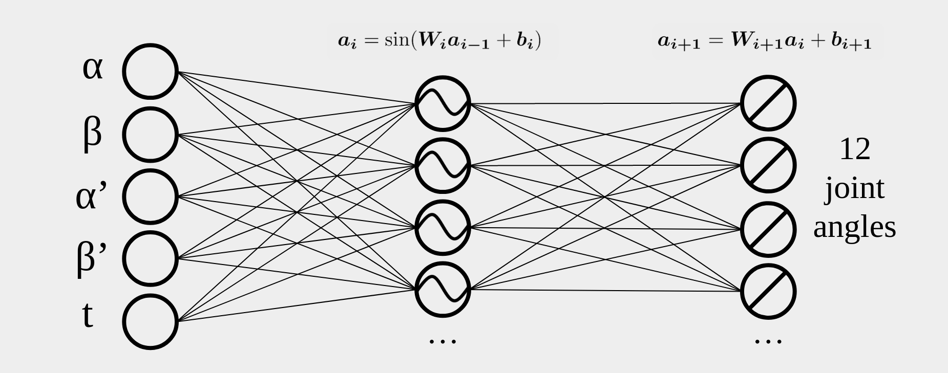 The inputs are just the IMU pitch and roll, the angular velocities in the same axes and time (to make the sine oscillate in the first place). We can modulate the sine frequency and phase in the sine layer, and its amplitutde and offset in the linear layer, meaning the training algorithm can fully modulate the oscillation.