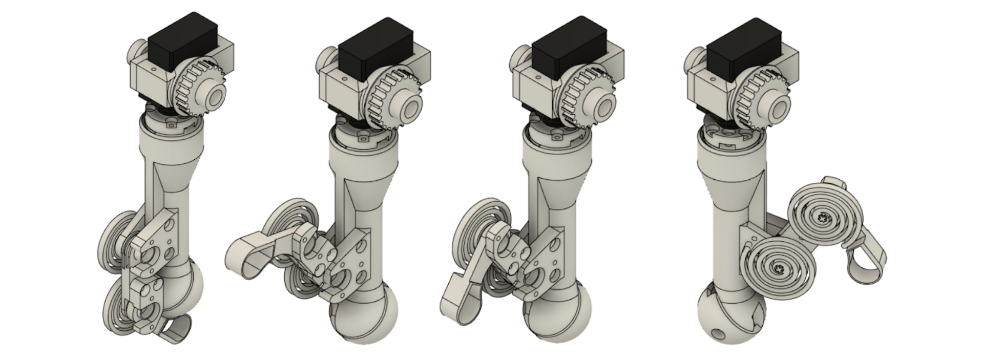 The cables driving the pincer are routed in such a way that they do not experience contraction/extension as the knee joint rotates. They pass through a channel on the knee axis, followed by a conical channel in the tibia and finally reaching the finger. Here’s a GIF that can show it much better than I can put it in words: