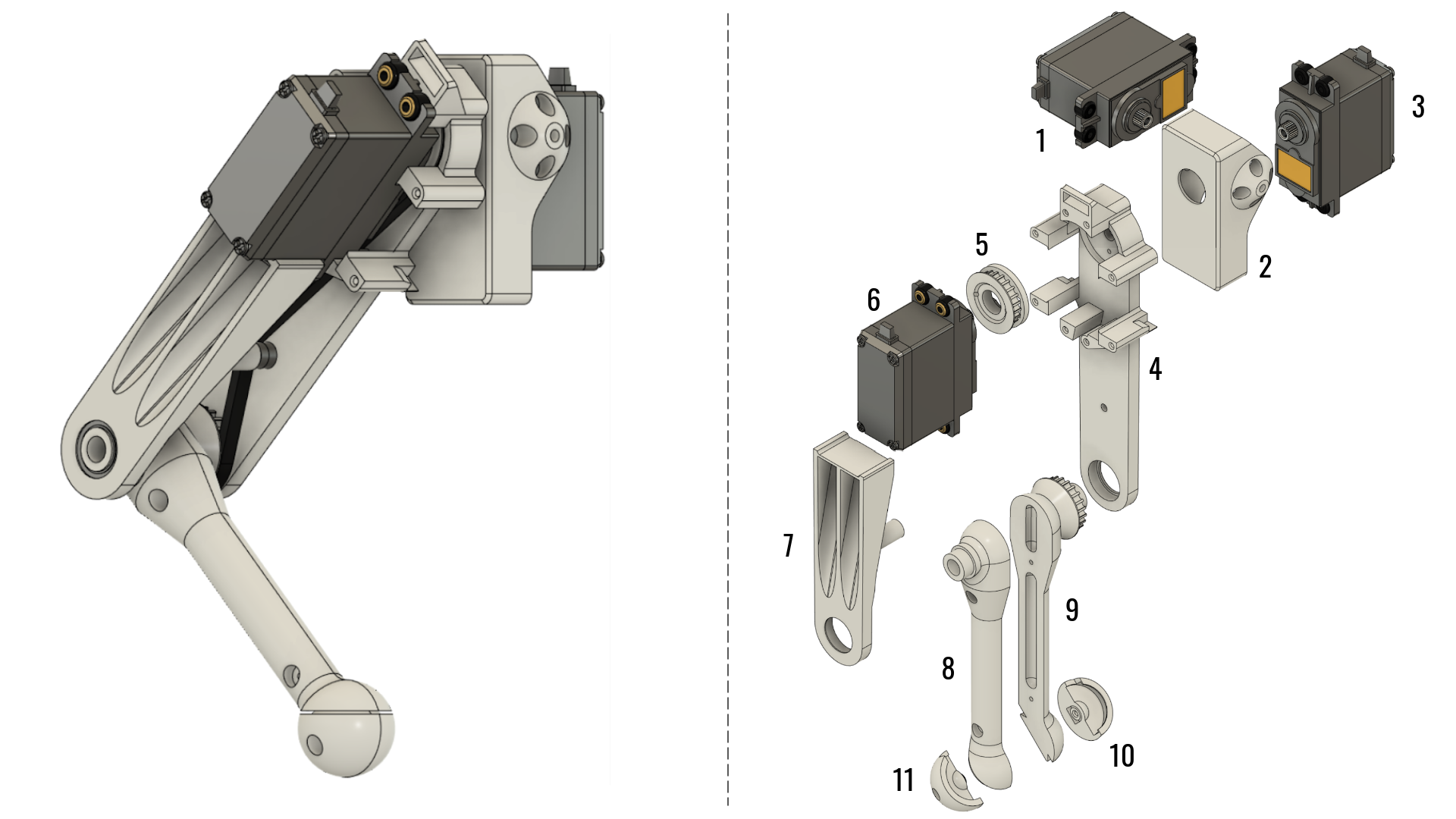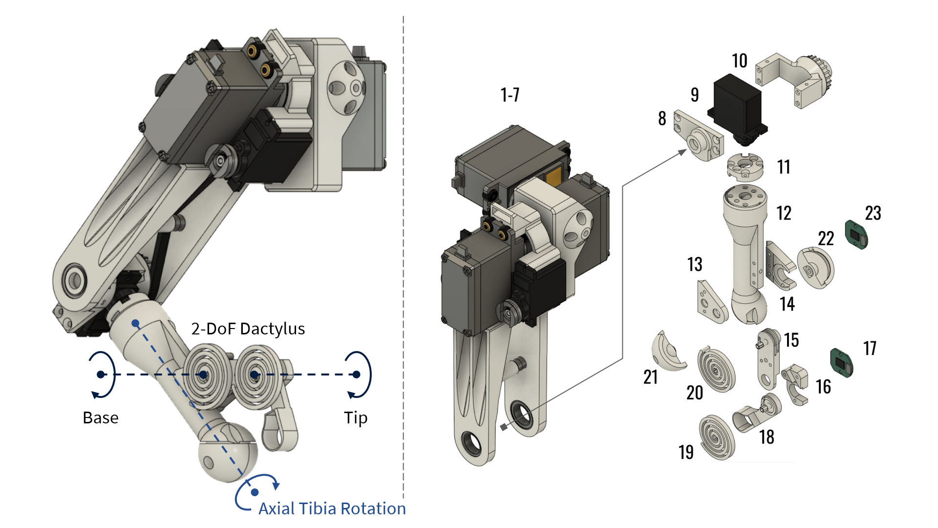 - The tibia servo motor is integrated as a stress-bearing member, improving leg resistance to side forces.