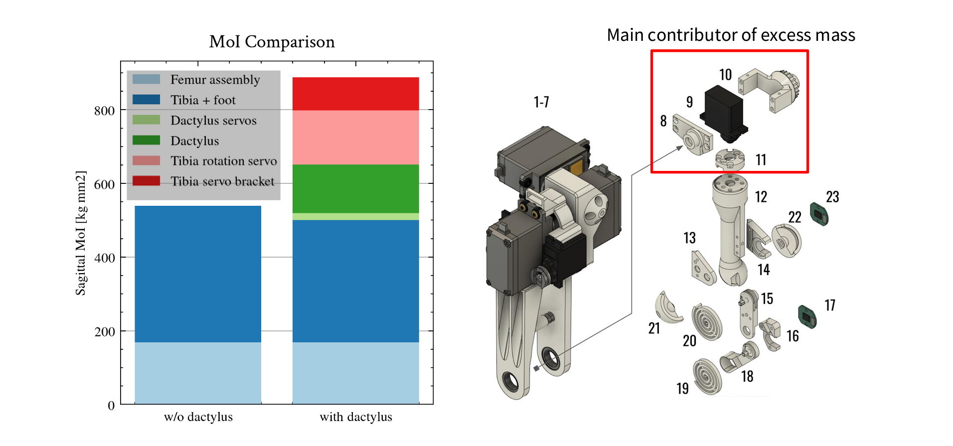 The MoI of the grabby leg is higher than the non-grabby one, which is expected. Looking at the MoIs on a part-by-part basis we can see why: